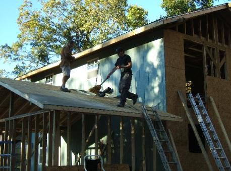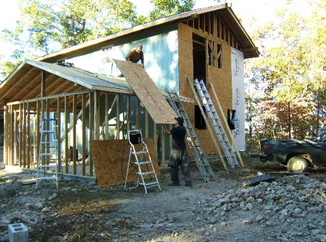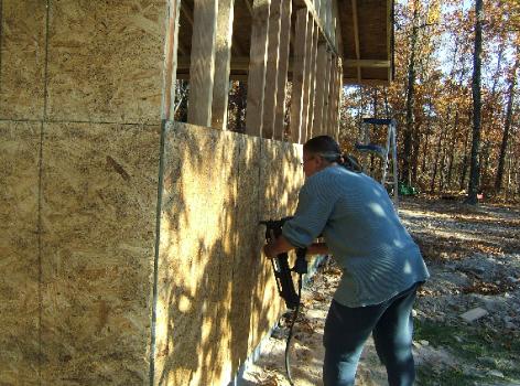 | The sheeting is being nailed before the weather barrier is put in place. |