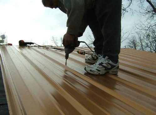 When installing metal roof panels, it is imperative to wear the right shoes and clothing that adhere to the slick surface. My regular tennis shoes supported me very well but my clothing (cotton and poly-blends) provide absolutely no traction on these panels. |