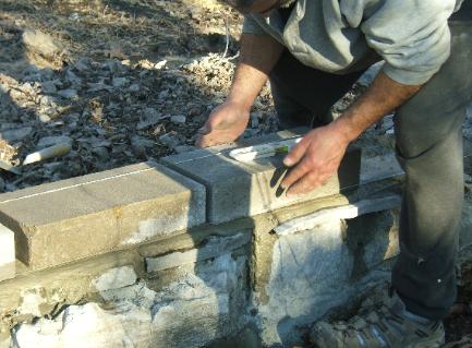 We used cap blocks to level the perimeter above the rock foundation to serve as a reference point for pouring the concrete floor. We leveled all four corners of the foundation with cap blocks using a laser level. A string connected to each corner provides the height for cap blocks to be placed on each wall. |