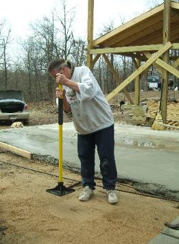 We are almost quarter of the way through pouring the concrete floor. We had a few nice (above freezing) weekends in January and February that allowed us to finish the task before the hot weather arrived. We used 5/8" rebar at 17" intervals and wire cloth on top of the rebar. We poured a 4" slab that consist of 3 parts sand/gravel to 1 part Portland cement. Here Peggy is packing the sand down; preparing it for the next section to be poured |