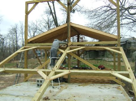 Here a row of cap blocks is almost finished. Cement block pillars were placed on the ground to support the middle beams before filling the area with rocks and dirt. The dirt was then packed down using the tractor. After applying 4" of sand atop the dirt, it was once again packed down before pouring the concrete. |