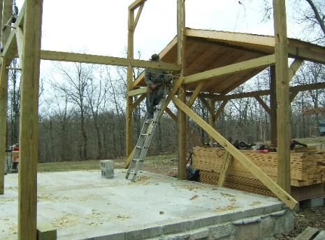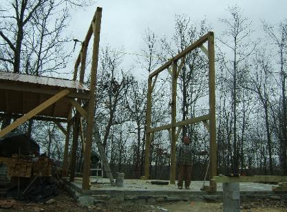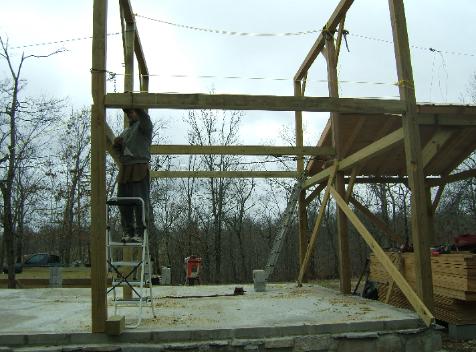 With the wall leaning at the 10 degree angle we placed all the three floor joist in place at the same time and used comealongs to tie the two walls together. Regardless of your efforts to be accurate, be prepared to make final adjustments as you go. |