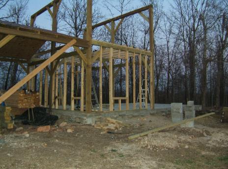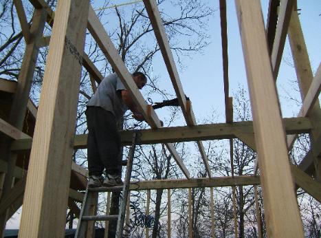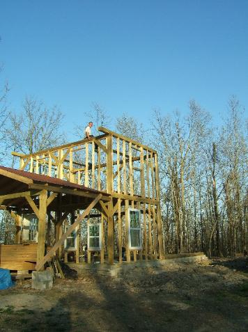 The 2x4 studs are helping to reinforce the skeletal structure. The remaining door and window openings are ready for the arrival of special ordered materials. Peggy is enjoying the view from the second story. |