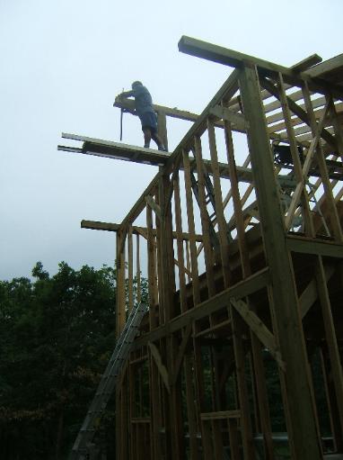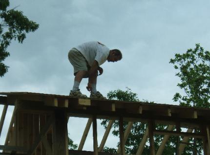 Sometimes you just have to go out on a limb to get the job down. We tied a ladder to the second wall and placed a 2X8 on it so I could walk to the end of the overhang of the ridgepole. From here, we nailed the remaining rafters in. |