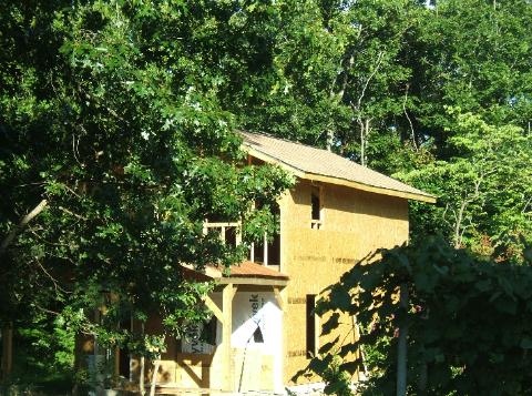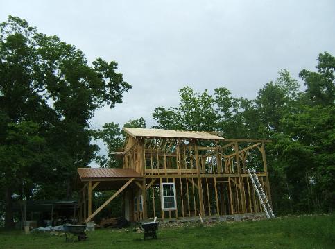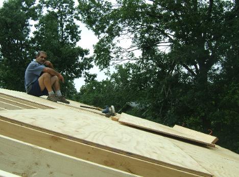 Putting the 4'X8' sheets of plywood on the roof took some planing. We completed the rafters 3/4 of the way and used the remaining opening to carry the plywood up to the roof. |