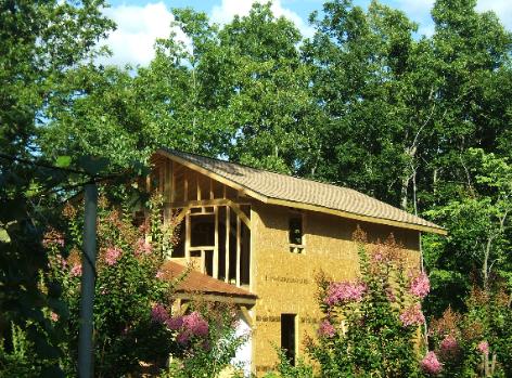 We finished the roof shingles just before the real hot temperatures arrived. Even with 90 degree weather we couldn't sit on the roof to make cuts and adjustments and our feet would get hot from standing on the shingles. We chose to put on 30 years architectural shingles with almost a full length ridge went. |